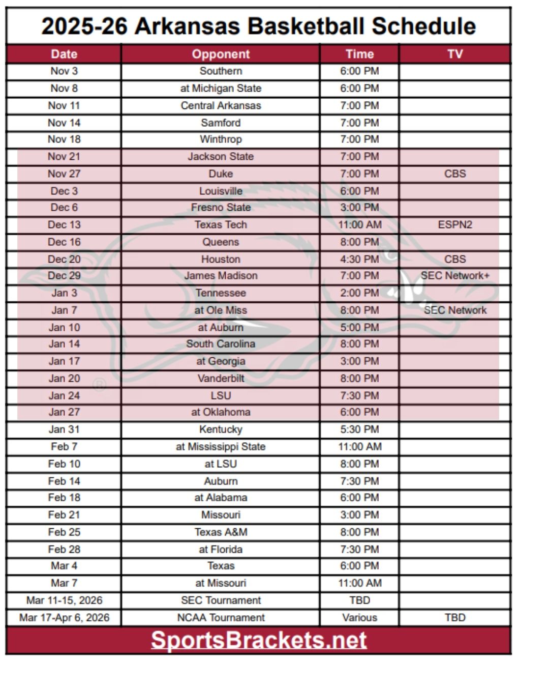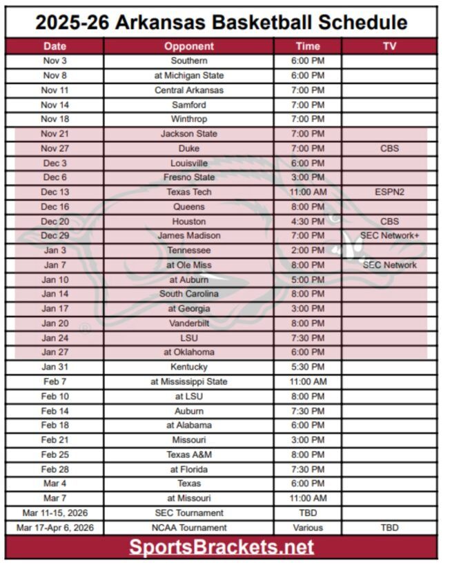 Ecco il programma stampabile del basket dell’Arkansas 2025-26. Abbiamo incluso tutte le partite confermate per il programma e la postseason dei Razorbacks. Puoi stampare il programma come mostrato nell’immagine o anche in formato PDF. L’Arkansas apre la stagione regolare il 3 novembre 2025 contro Jackson State.
