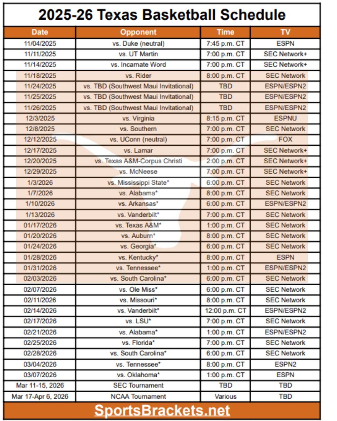 Ecco il programma stampabile del basket Texas 2025-26. Abbiamo incluso tutte le partite confermate per il programma e la post-stagione dei Longhorns. Puoi stampare il programma come mostrato nell’immagine o anche in formato PDF. Il Texas inizia la stagione regolare il 4 novembre 2025 contro Duke
