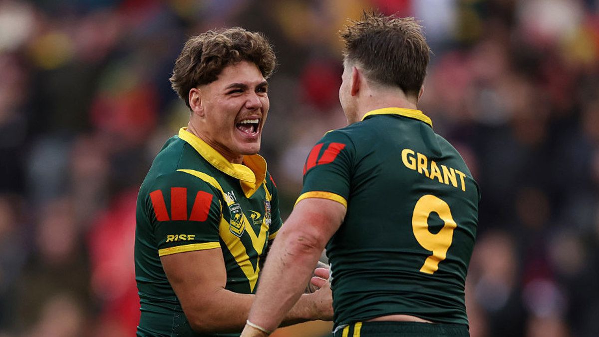 Reece Walsh e Harry Grant dell’Australia festeggiano dopo aver vinto la prima partita. Getty